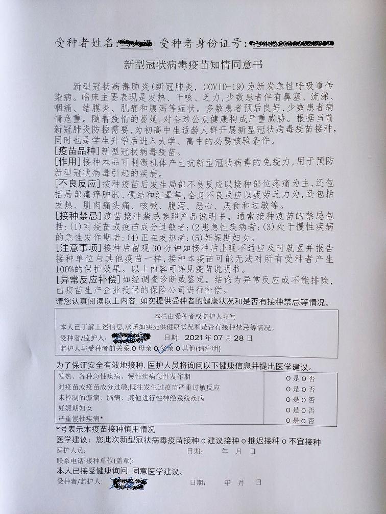 13、14周岁新冠疫苗接种知情同意书