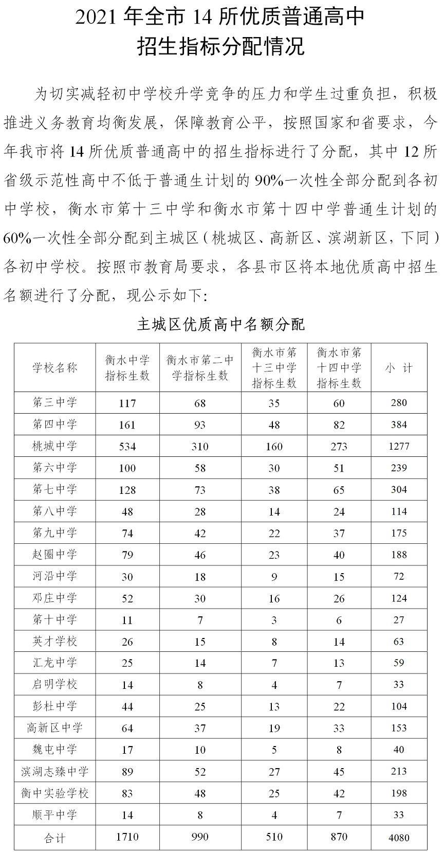 2021 年全市 14 所优质普通高中招生指标分配情况