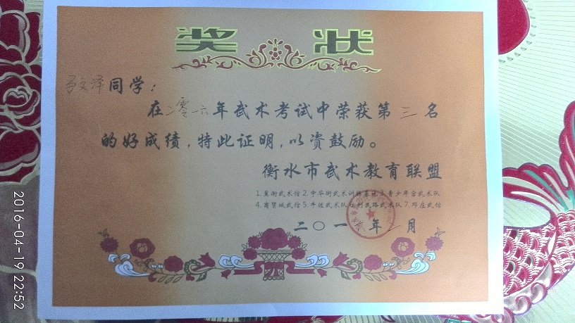 第一张奖状(武术第三名)