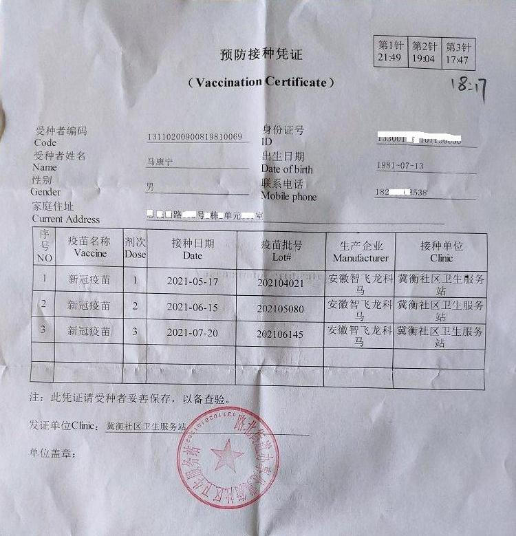 新冠疫苗,安徽智飞龙科马,接种第 3/3 剂次